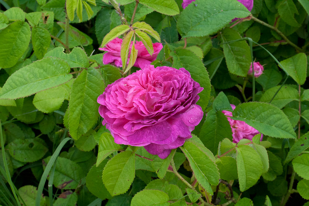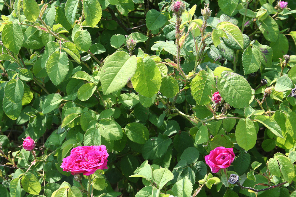 Vigorosa, pochissime spine con un fogliame ricco verde grigio. I fiori rosso magenta intenso sono ben formati, all'apertura piatti. Alta e vigorosa e' particolarmente adatta a formare gruppi in giardini alberati.