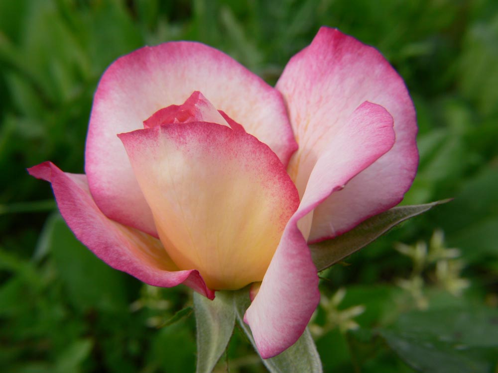 Bianco argentato con tracce di rosa rosso ai bordi dei petali sono i fiori grandi, semidoppi di questa pianta forte, sempre in fiore. Una eccellente piccola rampicante da tenere vicino a casa.
