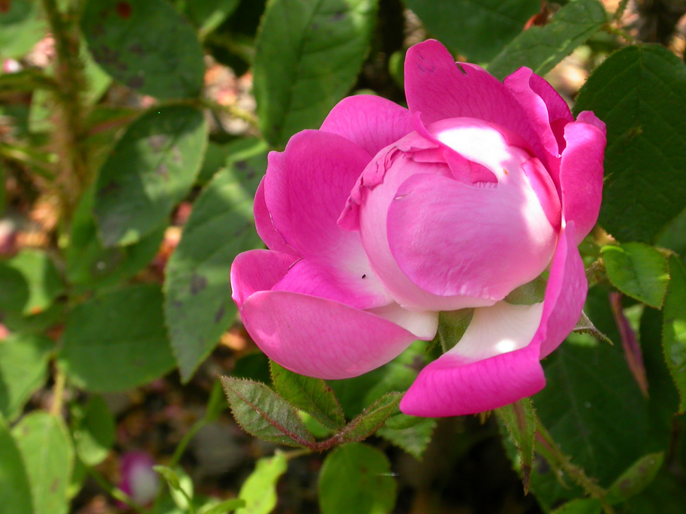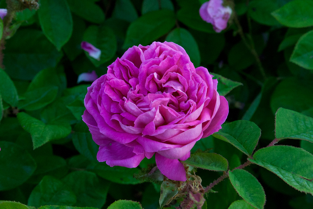 I fiori cremisi, stradoppi, profumati, inizialmente sono a forma di coppa per poi appiattirsi all'apertura e ripiegandosi all'indietro mostrano un grande occhio verde al centro. Il tomento e leggermente piu' scuro del fogliame. Adatta a formare gruppi nelle aiuole.