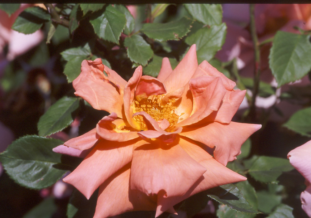 Portamento vigoroso con rami eretti e spinosi. I fiori sono rosa corallo sfumati di giallo. Adatta a coprire un pilastro.
