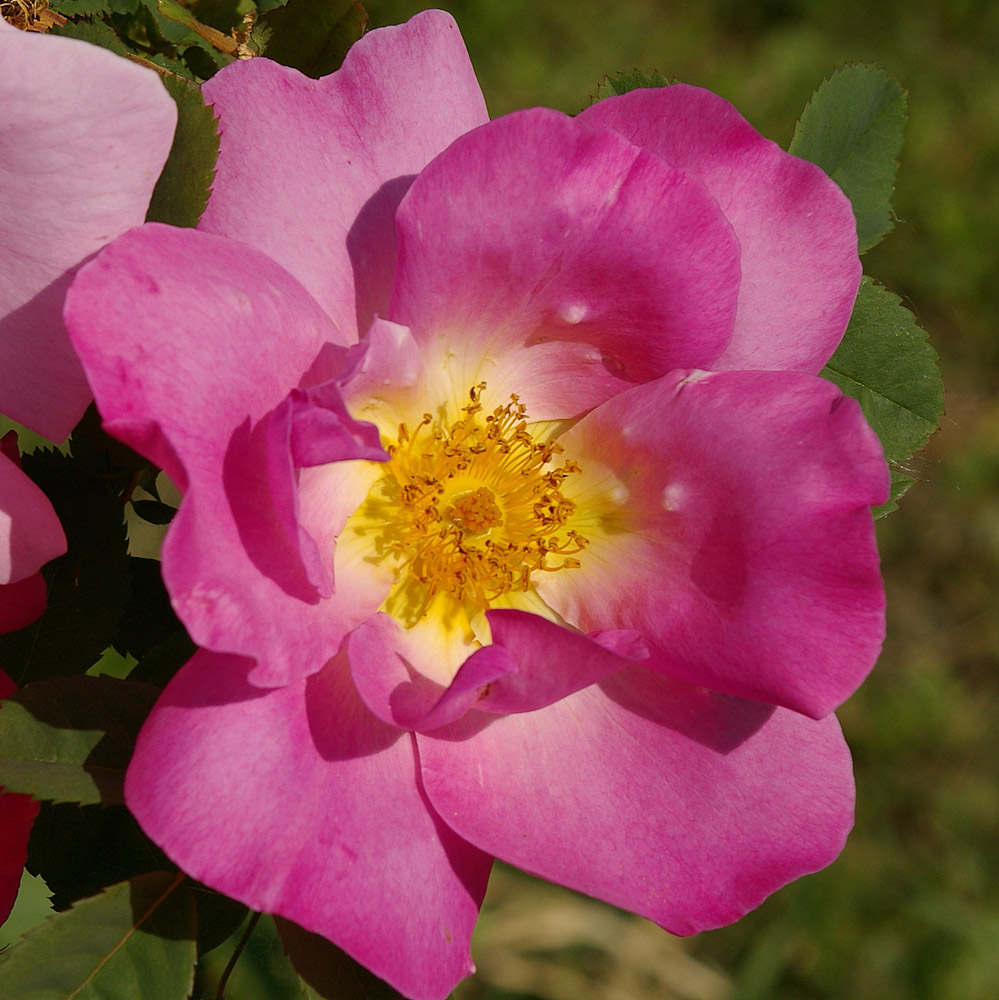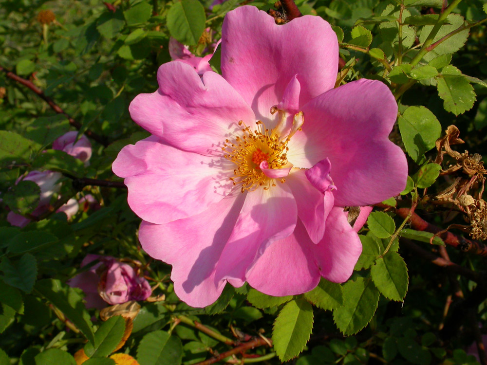 Bellissima rosa con fiori grandi, semplici, leggermente arruffati, rosa tenero, prodotti con abbondanza da una pianta solida, con poche spine. Ripete la fioritura ad intermittenza fino all'autunno. Particolarmente adatta a creare un centro di interesse, inserita in un prato.
