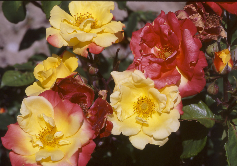 Giallo che vira verso il rosa, il colore dei fiori semidoppi portati da questa vigorosa rampicante, dotata di fusti robusti con fogliame verde scuro.