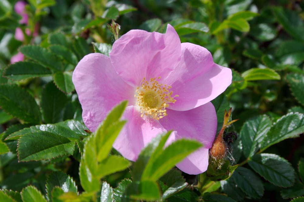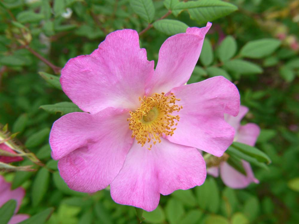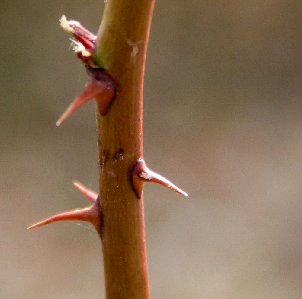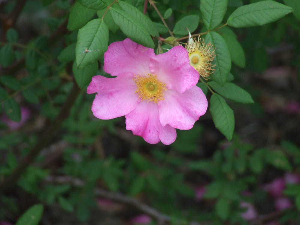 Questa rosa ha i frutti piu' grandi di tutte, color rosso arancio a forma di grossa bottiglia. Molto vigorosa. I fiori sono rosso ciliegia e le foglie sono grandi e verde cupo. Adatta a coprire pilastri.