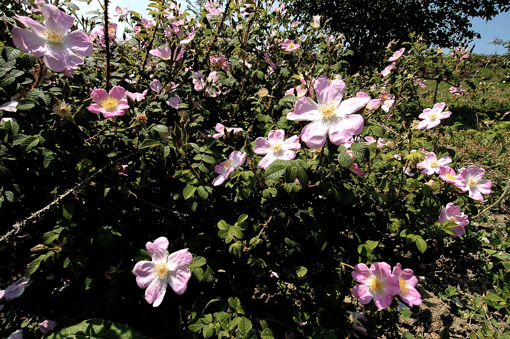 Arbusto quasi strisciante con rami molto spessi e intricati. Fiori rosa con cinque petali distanziati. Adatto a ricoprire scarpate. Radica dovei si appoggia.