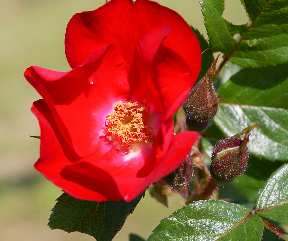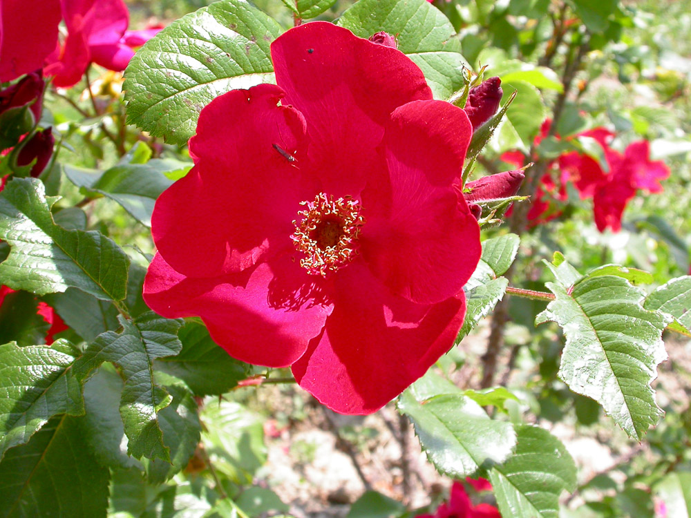 Pianta forte, robusta e densa. I fiori semplici sono profumati, rosso scarlatto, con belle antere. Ottima per formare delle siepi impenetrabili.