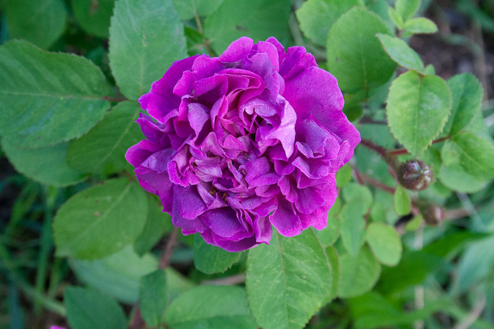 Arbusto molto vigoroso con grandi infiorescenze pesanti che e' meglio sostenere anche con un'altra rosa dai colori simili come una robusta sarmentosa bianco crema. Ben tomentosa, con foglie grandi, fiori grandi, semidoppi e profumati di colore che varia dal porpora al grigio, al magenta e rosa, leggermente piu' pallidi sul rovescio.
