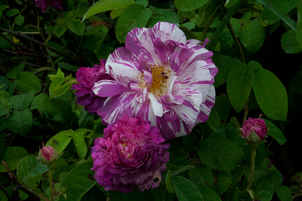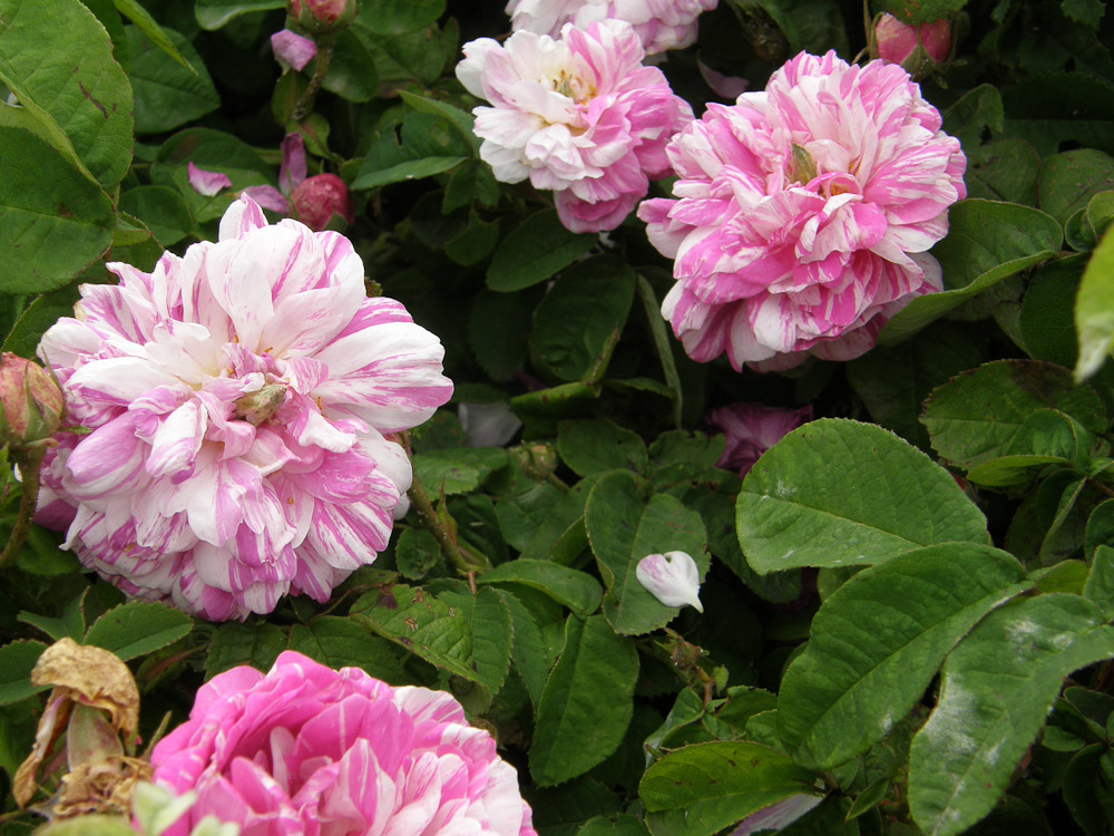 Fiori particolari, doppi, rosa pallido striati di cremisi, cambiano con l'eta' in una bella mescolanza di lavanda e porpora. Sono portati da fusti arcuati prodotti da una pianta cespugliosa. Sta bene nei vasi.