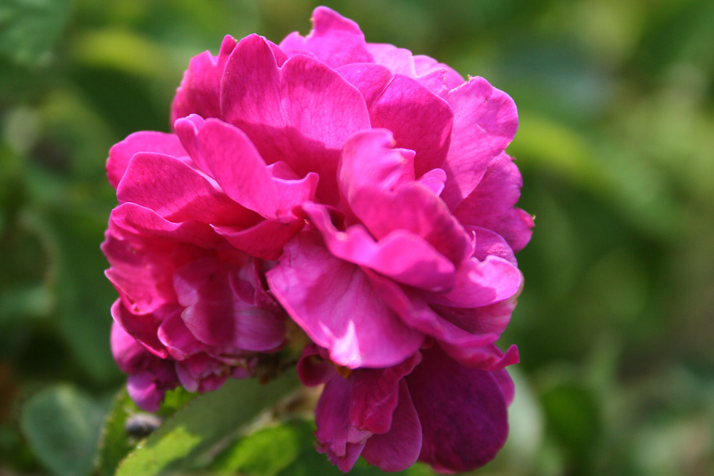 Quando i boccioli tendono ad aprirsi, sembra che questa rosa sia rosa, ma a completa apertura i pompon mostrano una varieta' di viola e vinaccia. Fiori di bella forma, in genere riuniti in grappoli e delicatamente vellutati. Profumati. Un cespuglio compatto, alto per essere una Gallica con fusti sottili e foglie medio verdi che tradiscono una discendenza diversa dalla Gallica.