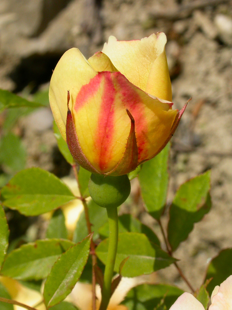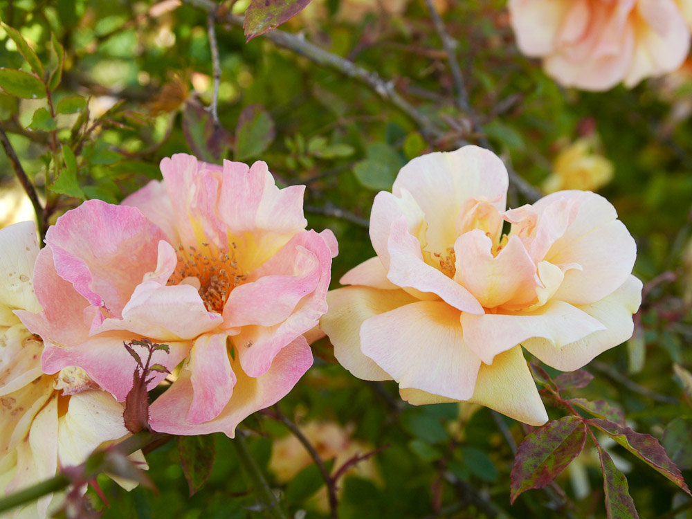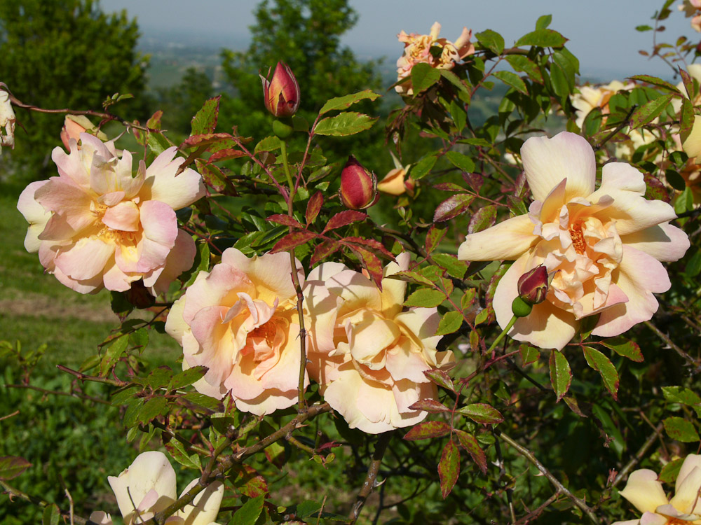 Fiori doppi, leggermente lassi, con petali giallo camoscio, con velature arancio. Profumata. Il modo migliore di coltivarla e' in mezzo a cespugli in una siepe mista in posizioni calde e riparate.