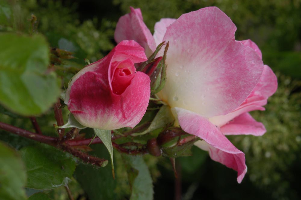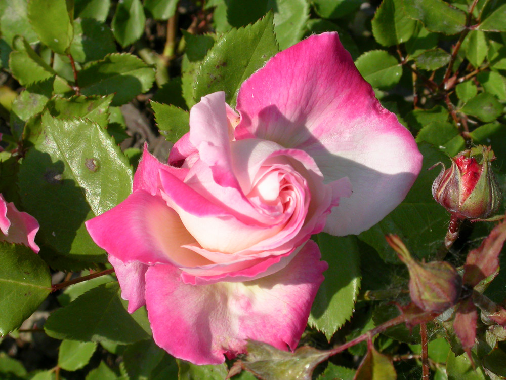 Pianta robusta. Portamento ramoso. Fiori rosa incarnato e bianco, a volte con i margini rossi. Poche spine e belle foglie ne fanno una rosa adatta ai vasi in postazioni calde e riparate.