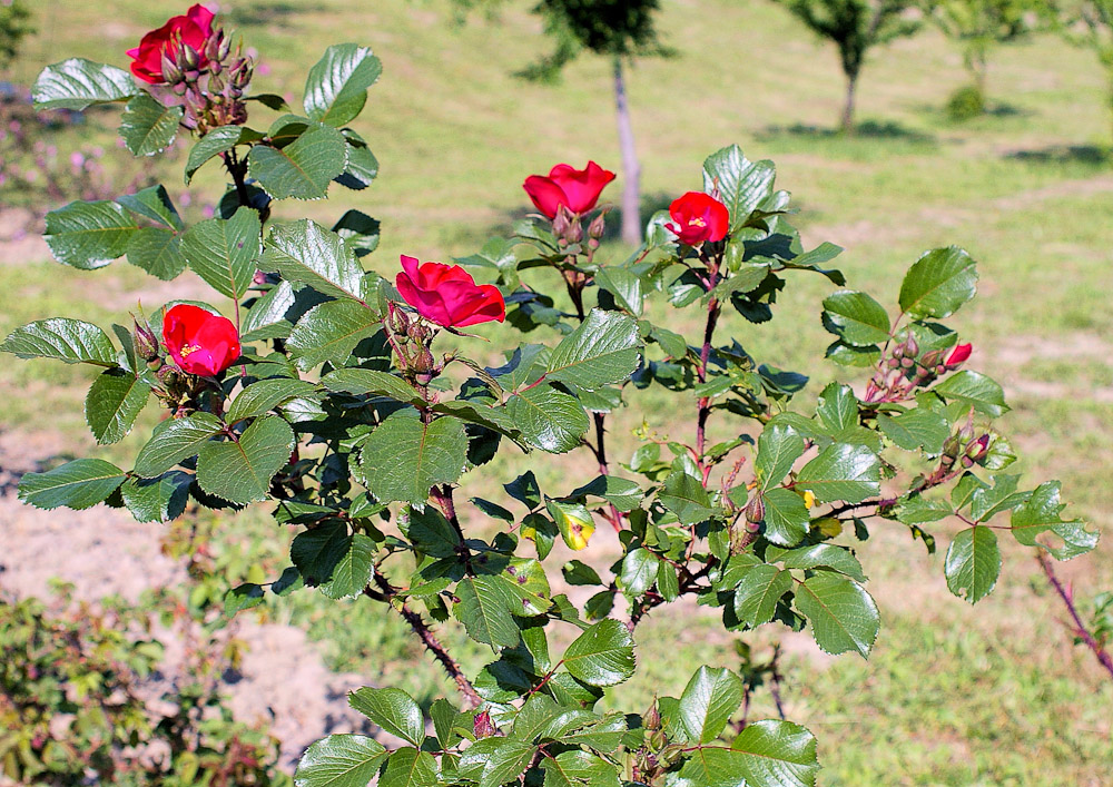 Pianta forte, robusta e densa. I fiori semplici sono profumati, rosso scarlatto, con belle antere. Ottima per formare delle siepi impenetrabili.