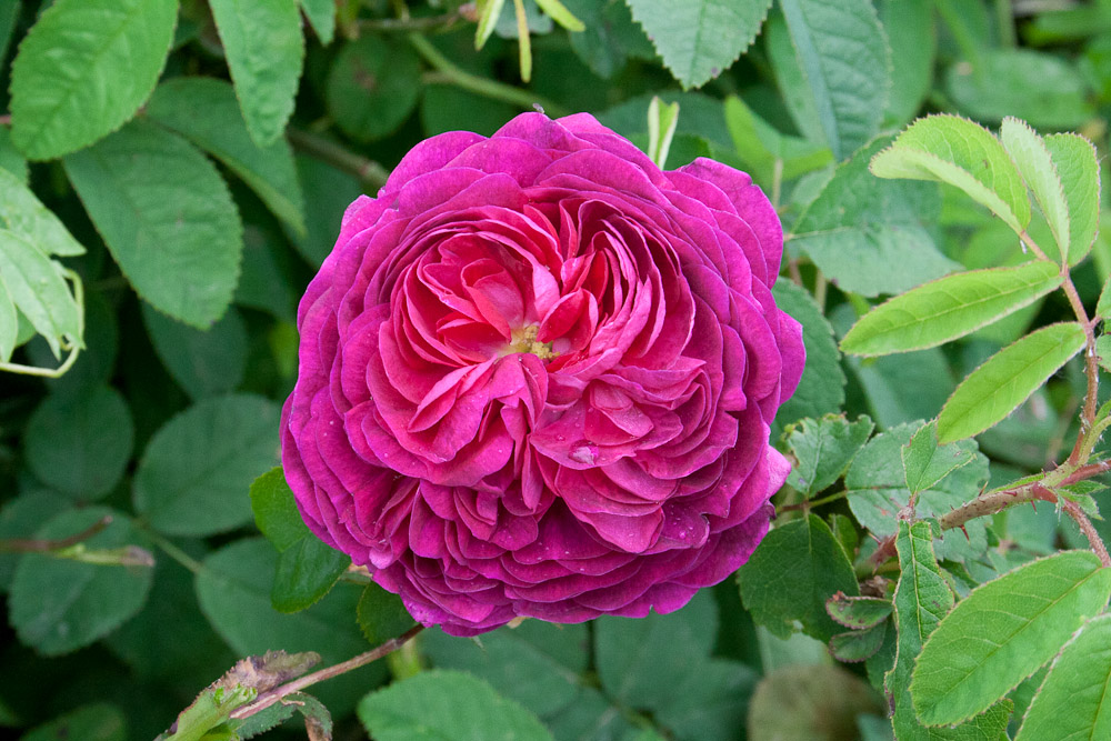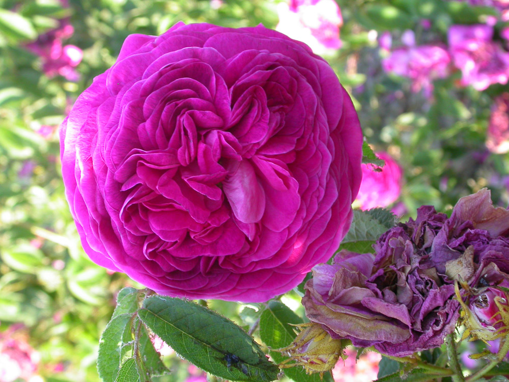 Riconoscibile immediatamente per i fiori di forma piatta, simmetrica (non in quarti, ma piu' simile ad un garofano) e i suoi fantastici colori scarlatto, marroni e porpora, questa rosa e' una delle migliori rose da giardino per gli amatori. Talvolta i petali formano un contorno perfetto, come se la rosa fosse racchiusa da una invisibile rete circolare. Ad apertura completa i fiori talora presentano un occhio centrale verde scuro. Il cespuglio, praticamente senza spine, e' letteralmente soffocato da una nuvola di fiori ogni anno, e per fare cio' non richiede una cura costante. Pollonifera, tende a espandersi. Con il tempo umido e' meglio togliere i petali sfioriti.