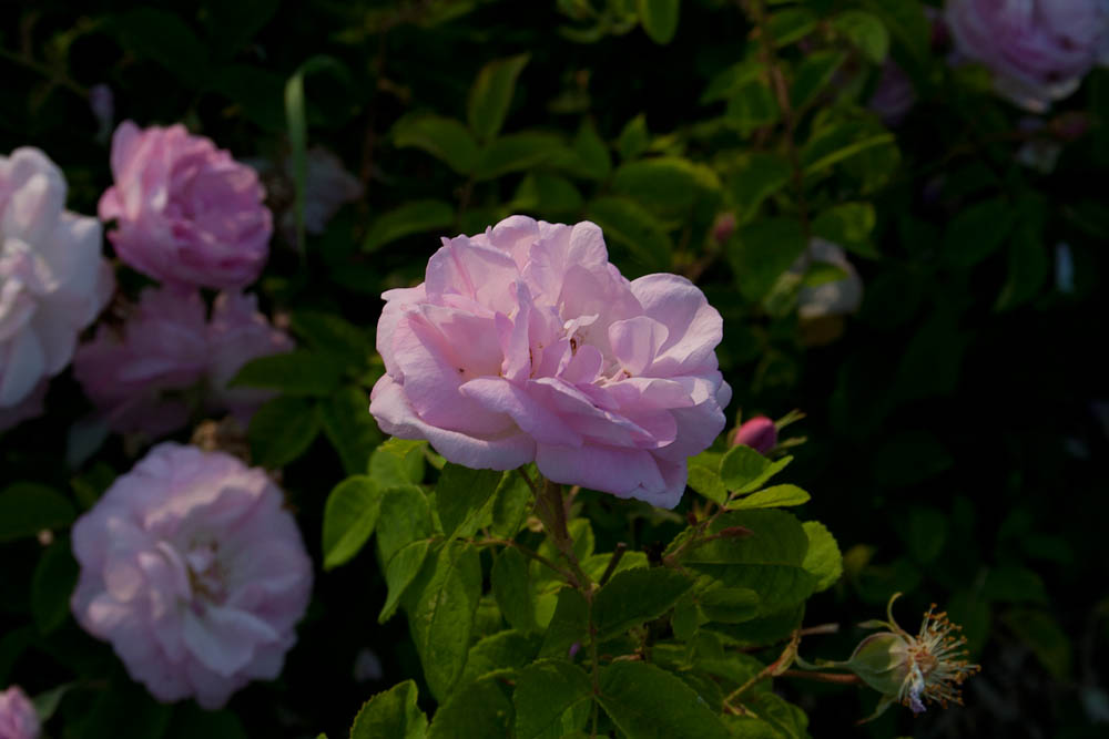 Fiori rosa tenue, piatti all'apertura, doppi, petali ripiegati all'indietro quando completamente aperti. Arbusto spinoso con piccole foglie verde grigio. A suo agio nei vasi e a formare gruppi in giardini alberati.
