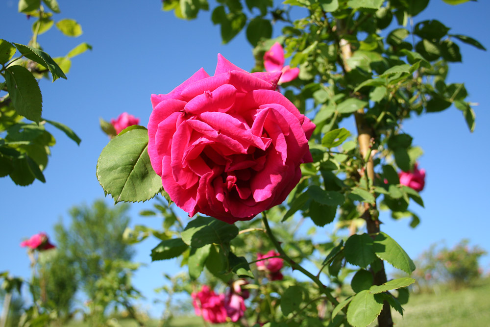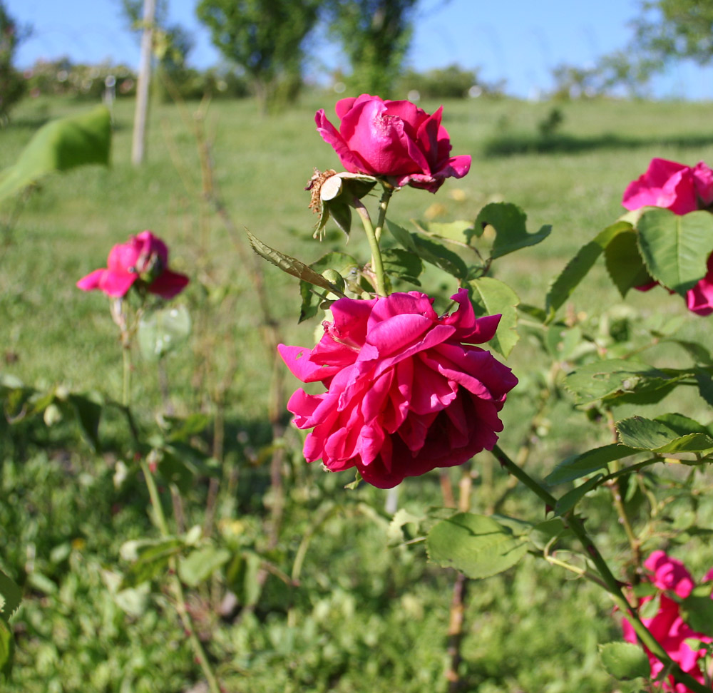 Rosso vivo con ombreggiature piu' intense, doppi con un leggero profumo. Il portamento vigoroso, ordinato e il bel fogliame la rendono adatta a essere coltivata in vaso.