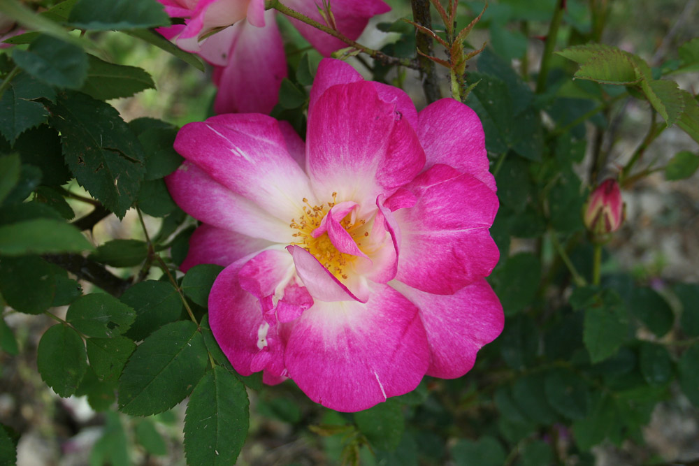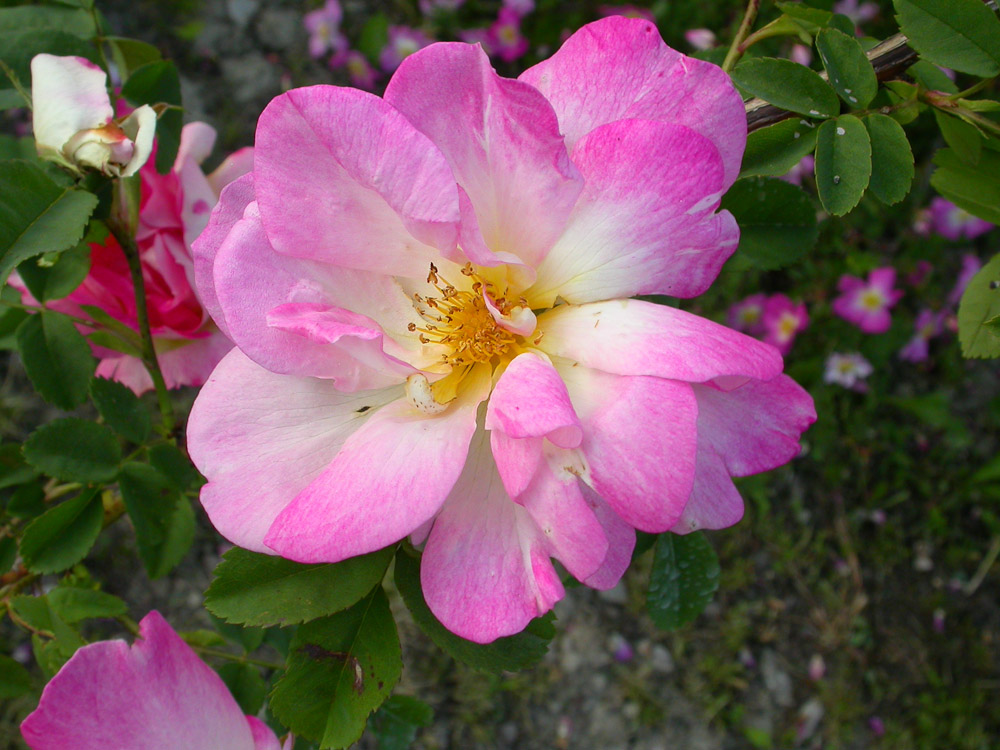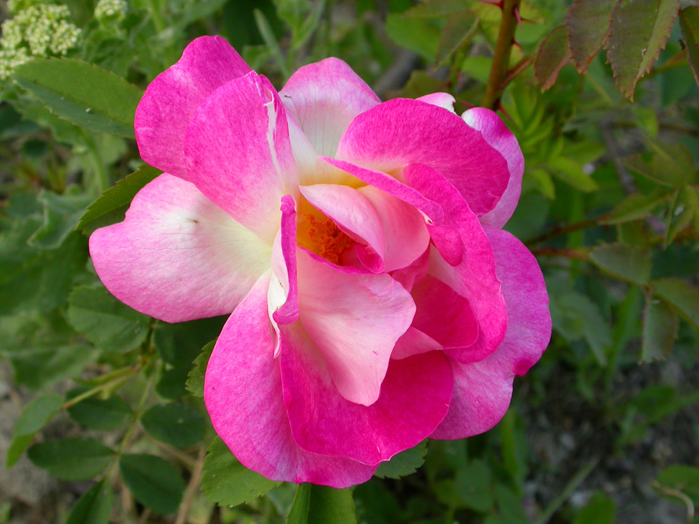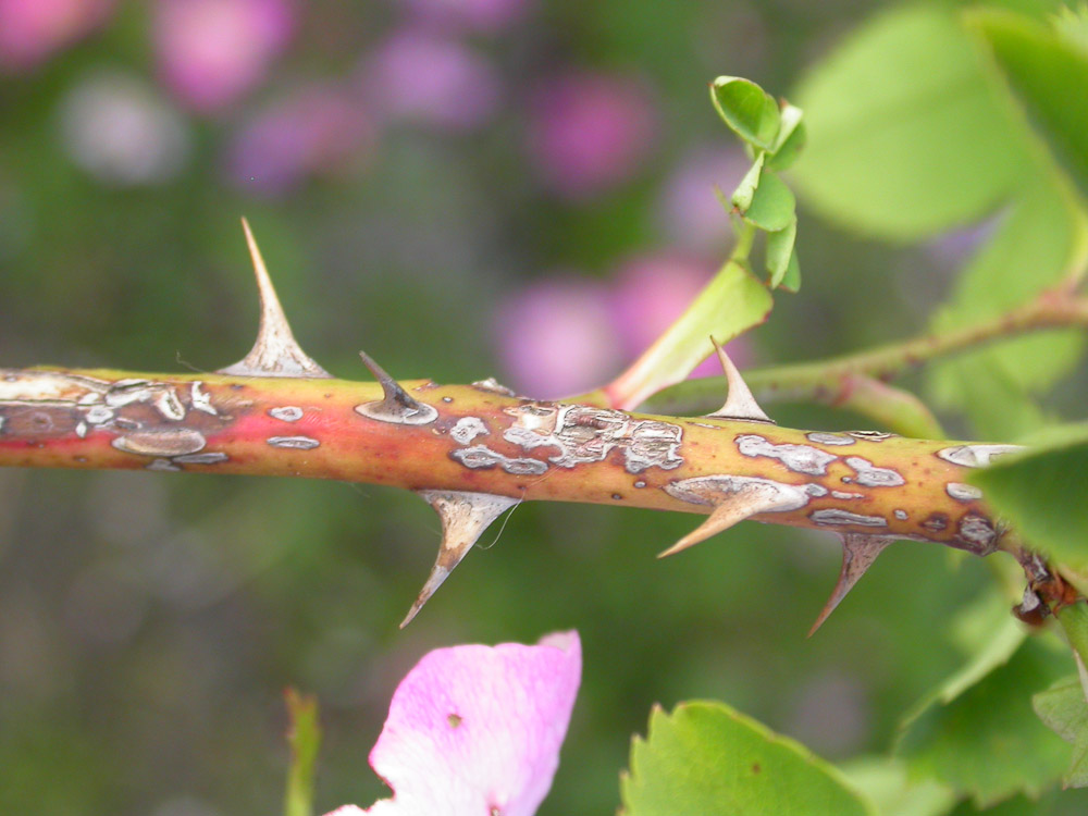 Fiori rosa argentato, quasi semplici, portati da una pianta sana, con fusti spinosi e il portamento eretto. Da utilizzare in una siepe mista.