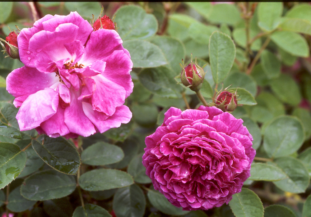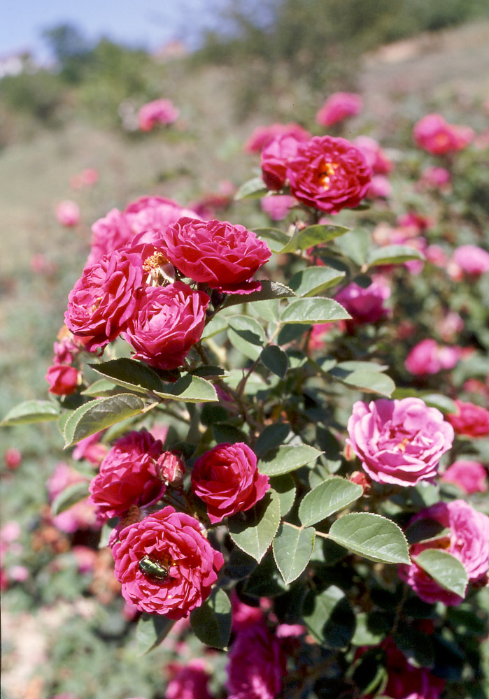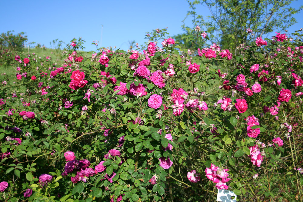 Una rosa piacevole che porta fiori doppi, cremisi intenso, scuro, con antere giallo brillante. Per la sua dimensione puo' formare un grande arbusto o puo' essere allevata come una piccola deliziosa rampicante.