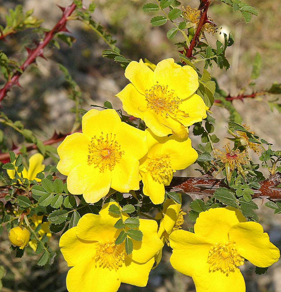 Un fine cespuglio con fiori singoli, dal colore giallo dorato ricco, prodotti con abbondanza all'inizio della stagione di fioritura. La crescita e' verticale, con rami e spine color marrone scuro. Il fogliame assomiglia alle felci, molto minuto ma prodotto in grande numero.