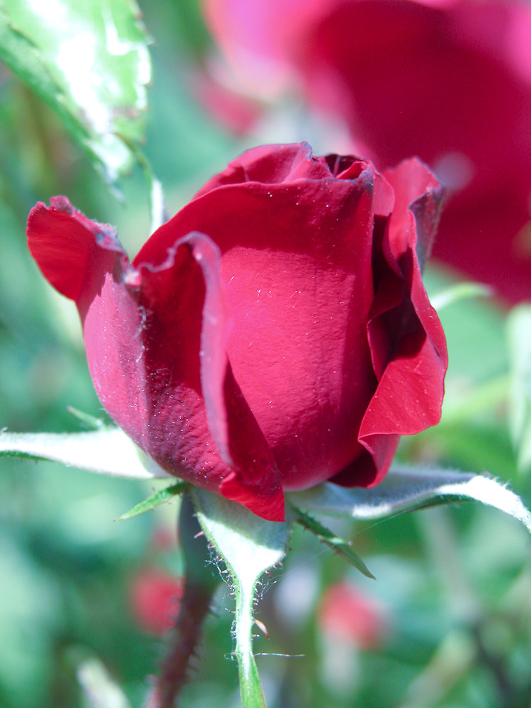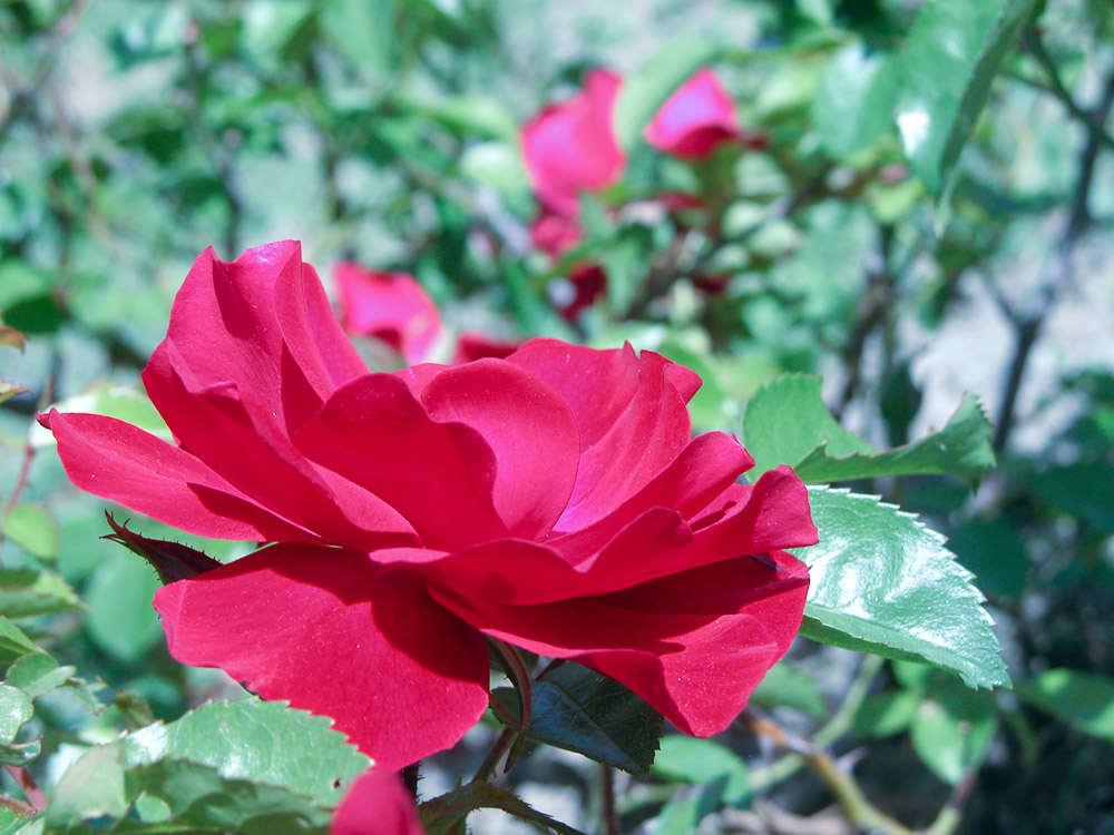 Grappoli di fiori grandi, semidoppi, cremisi, su una pianta aperta e vigorosa, con folgie verde scuro. In autunno produce frutti. Gestisce bene le postazioni a mezza ombra e le zone fredde. Bellissima piantata a gruppi in giardini alberati.