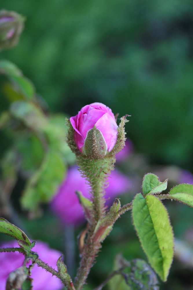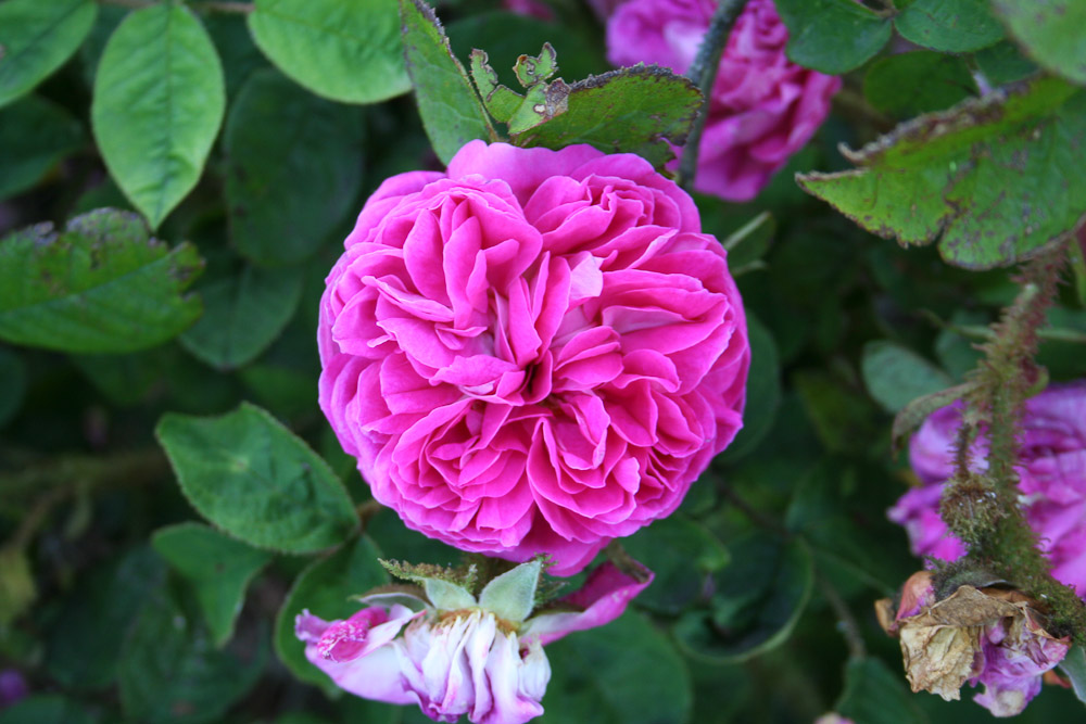 Rosa intenso con i bordi rosa chiaro, doppi e piatti sono i fiori di questa bella pianta. Il fogliame ha venature e bordi rossastri, il tomento setoloso, quasi porpora. Forma belle ed eleganti siepi.