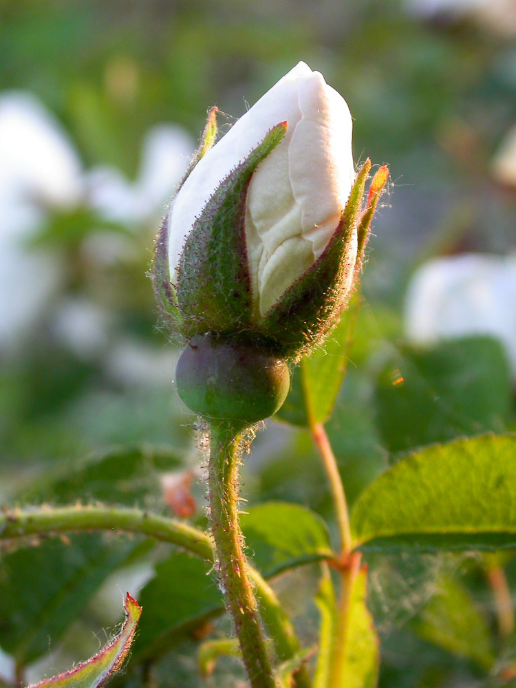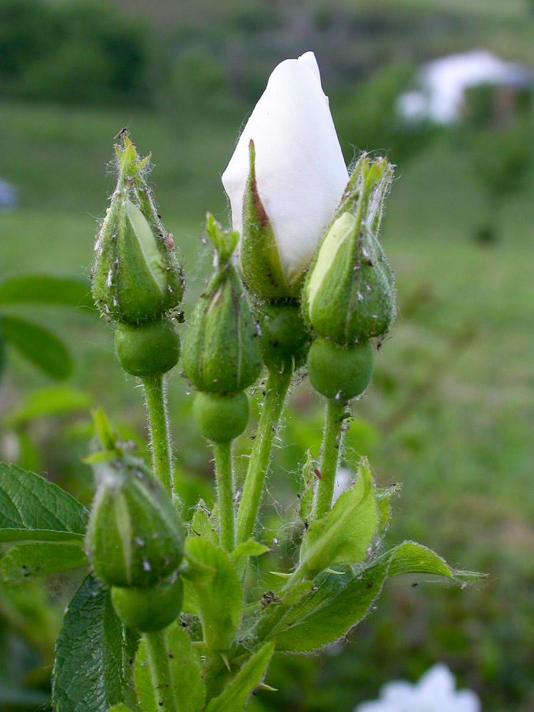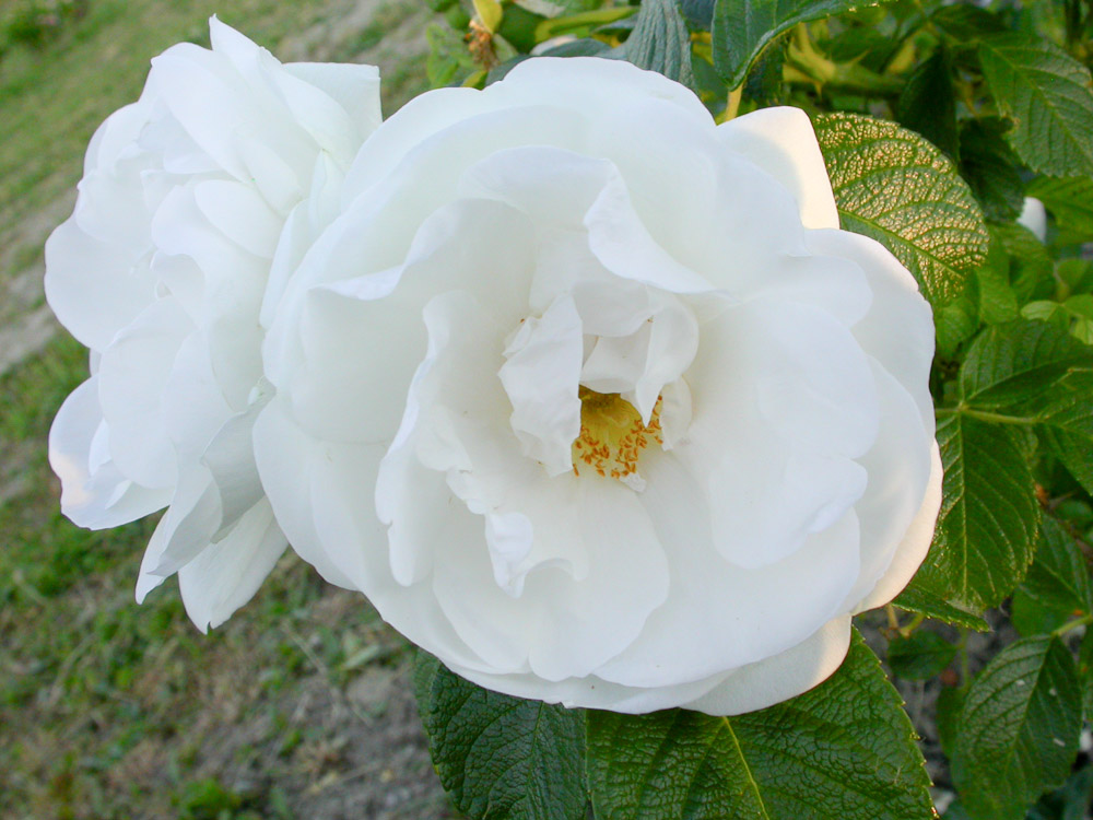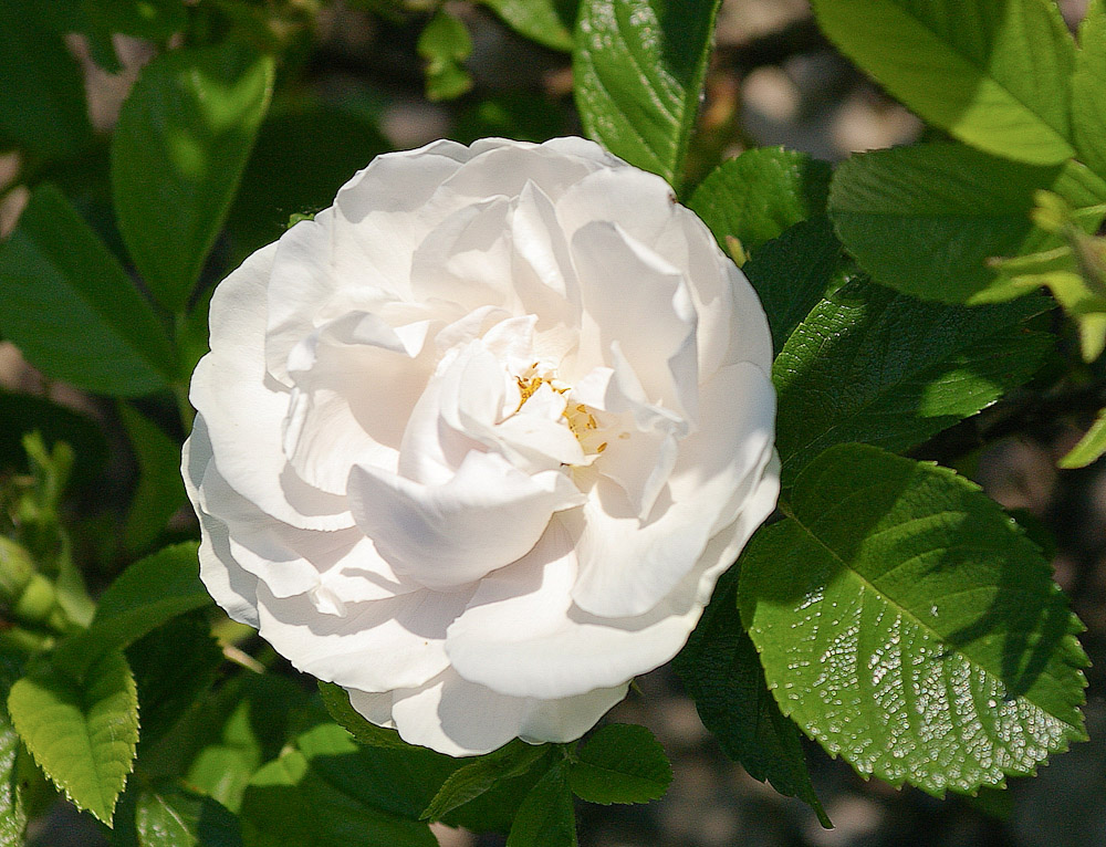 Bianco puro, semidoppi, portati con abbondanza e con un forte profumo, da cespuglio eretto e spinoso, con grandi foglie verde scuro. Adatta a formare gruppi nei giardini alberati. Buona anche nei vasi a mezza ombra.