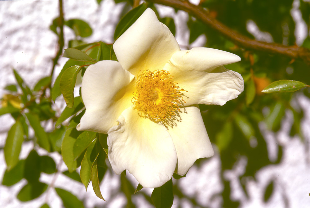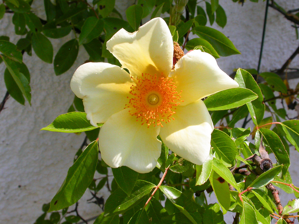 Grandi fiori gialli, profumati, prodotti singoli a a mazzi, con stami prominenti marrone dorato. Fiorisce continuamente da giugno ai primi freddi. Bellissime foglie grandi, quasi sempreverdi. La crescita e' veloce e molto forte. In grado di arrampicarsi anche sugli alberi e raggiungere grandi altezze anche in luoghi esposti a nord e a mezza ombra. Le spine sono pericolose, ad uncino. Non ama le potature. Valida anche allevata a fontana libera in mezzo a un grande prato.
