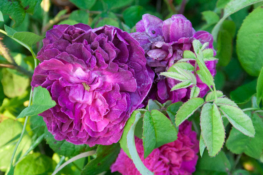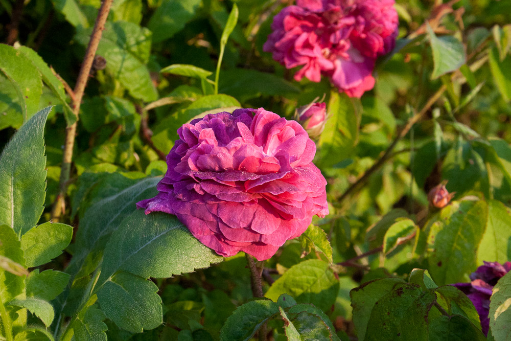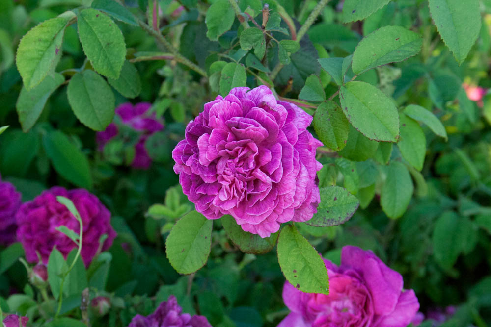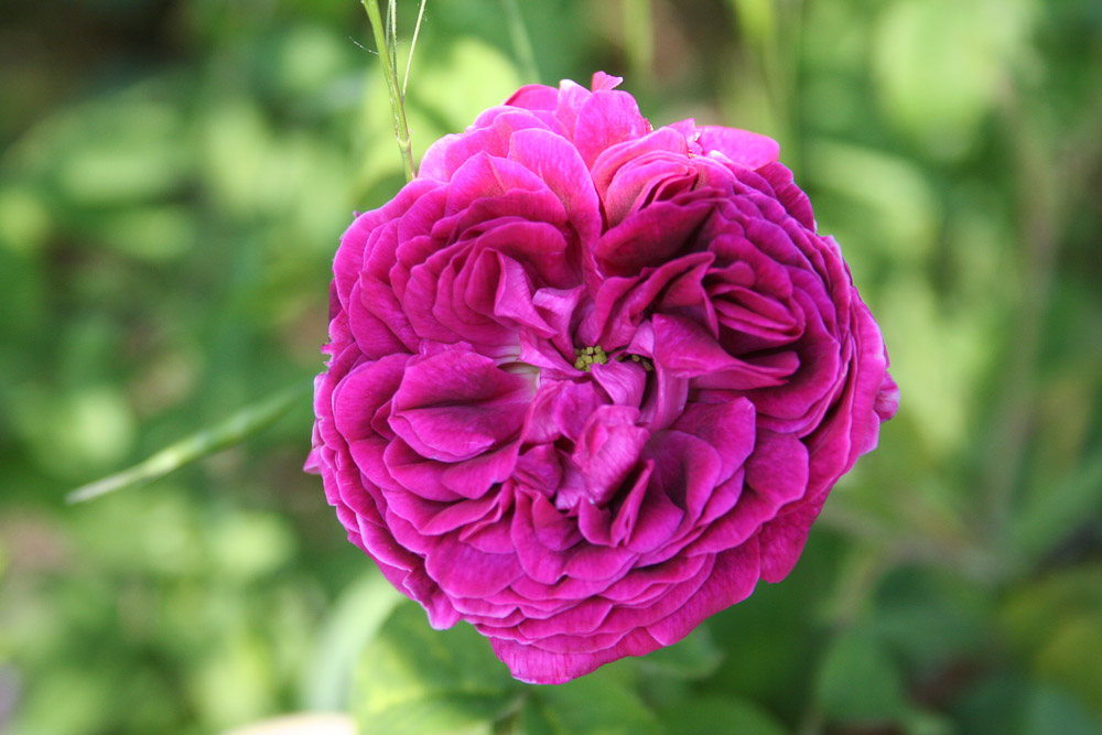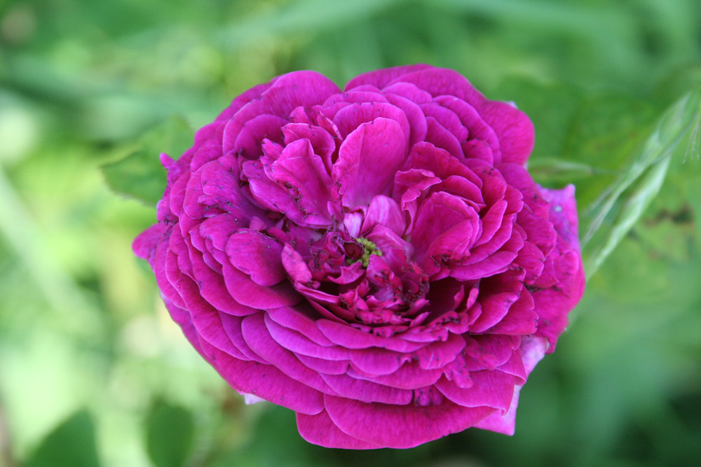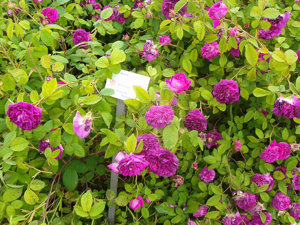 Fiori piatti e doppi quando aperti, con un occhio verde, colorati di cremisi vivo. Rami con poche spine e abbondanti foglie verdi. Varieta' di basso portamento, ideale per il piccolo giardino o per la coltivazione in vasi.