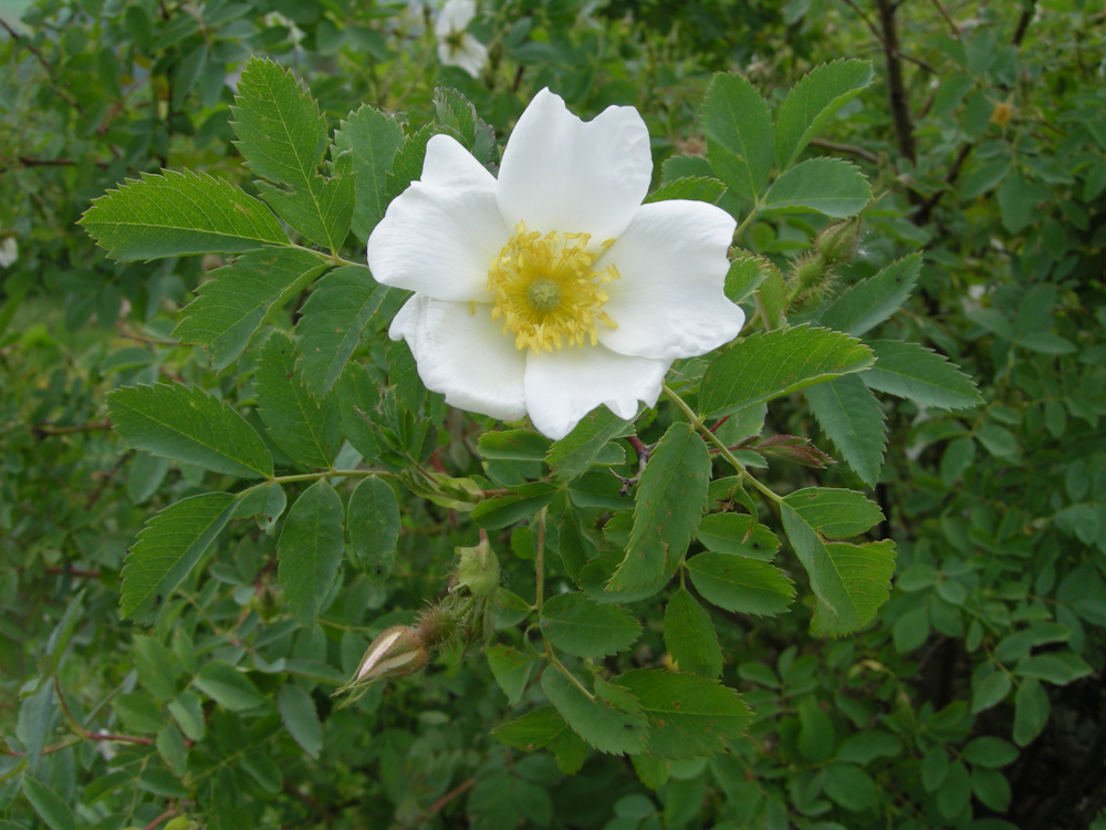 Rosa specie. Simile nelle dimensioni e nel fogliame alla R. canina. Produce fiori semplici, bianco crema rosati, seguiti da frutti rosso arancio. Ottima per siepi di confine.