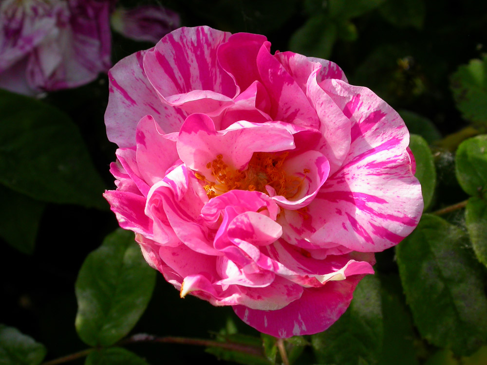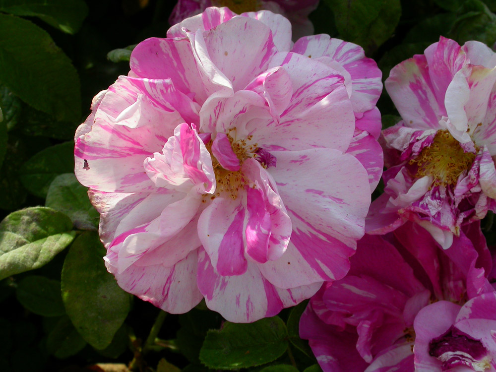 La Panachée, La Villageoise, Panaché, Provins Oeillet, Provins Panaché, Rosa gallica 'Rosa Mundi', Rosa gallica var. versicolor L., R. gallica variegata, Rosa Mundi, Rosier de France a fleurs panachées, Variegaded Rose, Versicolor, Striped Rosa of France, Rosamunde, Garnet Striped Rose, Rosemonde, Rosamondi, Fair rosamond's Rose, Mundi, Mundy Rose, Rosa versicolor, Rosa praenestina versicolor, Gemengte Rose, Rosa praenestina variegata plena,