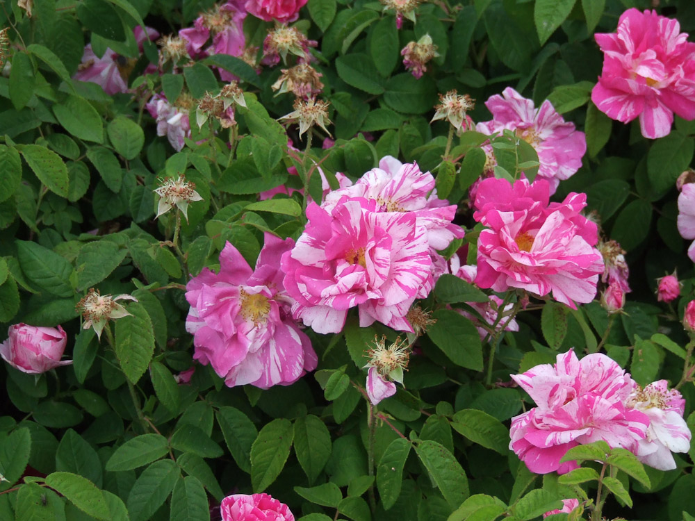 Questa rosa, assai antica, e una mutazione della R. gallica officinalis. Probabilmente e la piu' antica tra le rose variegate. I fiori sono cremisi chiaro e bianco, striati in modo diverso. A volte presenta rose non variegate insieme a quelle variegate. Su radici proprie e' fortemente pollonante e colonizza lo spazio intorno a lei. In grado di produrre fino a 800 fiori anno.