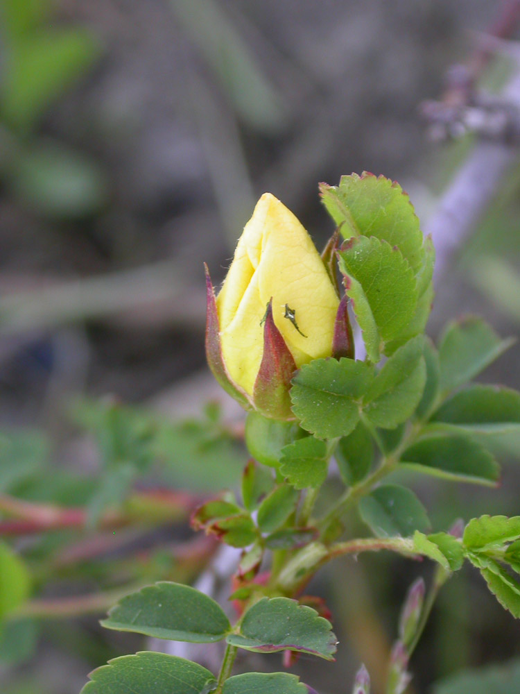 Rosa specie. Tantissimi fiori di media grandezza, giallo primula, portati da un arbusto eretto e forte, con molte spine. Fogliame simile a felce sia nell'aspetto che al tatto. I frutti, di colore rosso scuro, sono prodotti nella tarda estate. Ama il sole e il caldo. Adatta a formare gruppi nei prati di giardini naturali.
