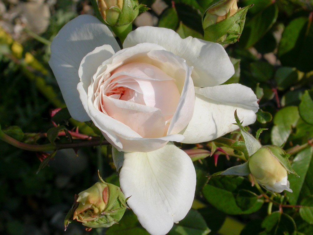 Fiori bianchi, completamente doppi, dolcemente profumati. Foglie grandi e numerose. Ama i luoghi miti e richiede cure particolari. Puo' essere allevata come piccola rampicante.