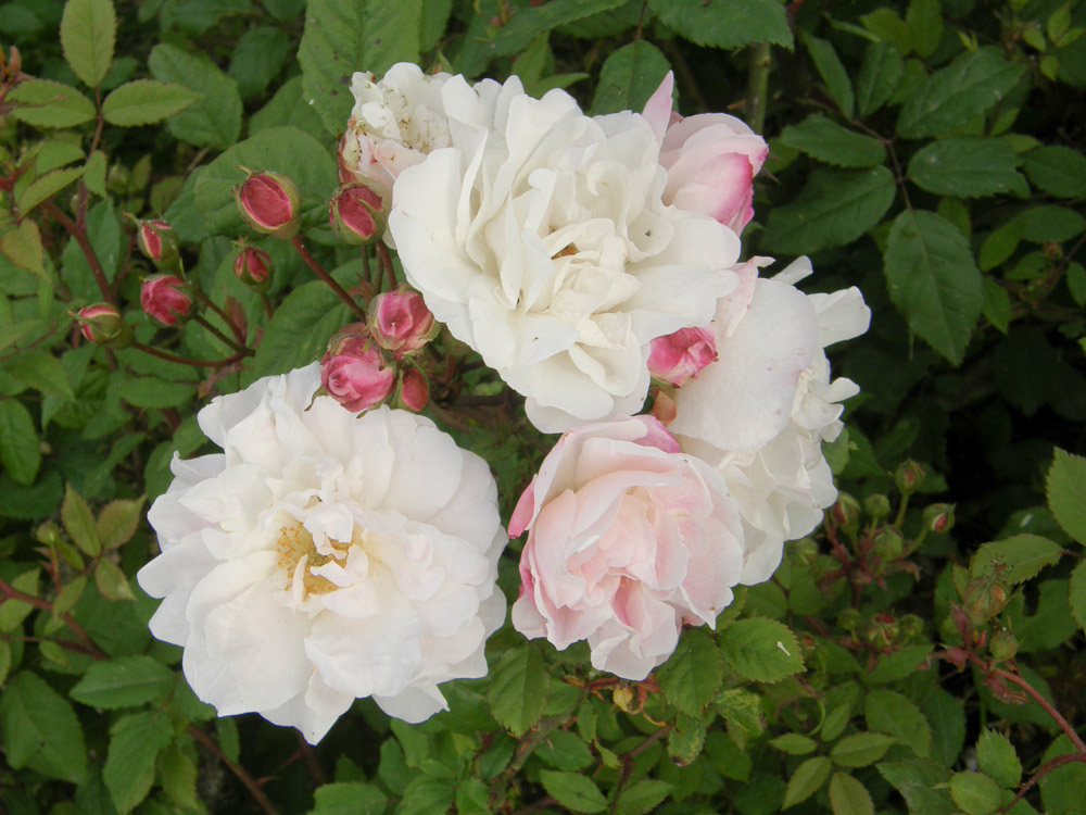 Fiori a grappoli cascanti, piccoli, bianco rosato, completamente doppi.Ha un leggerissimo profumo. Adatta ad arrampicarsi su un albero anche in terreni molto umidi.